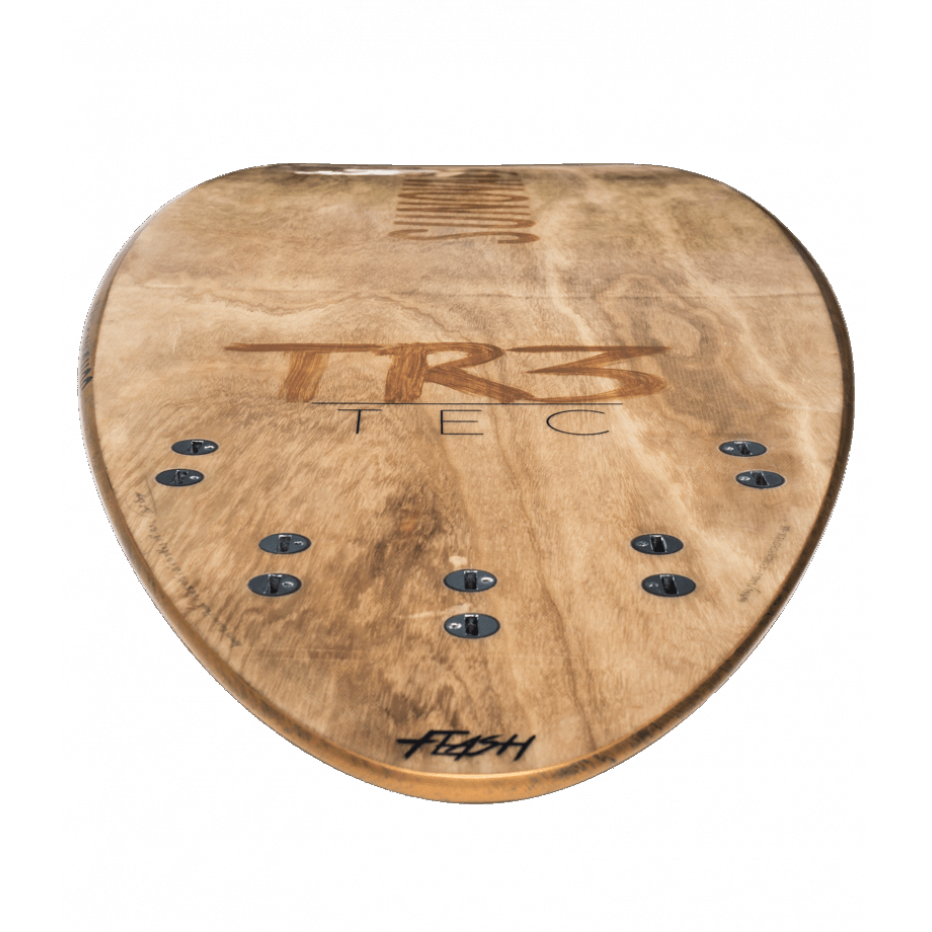 TR3 uses special paulownia wood. Approximately three pieces are used per board thus faster to apply and lighter than other techniques. It’s double the thickness of balsa wood, while using the unique sandwich technique this creates a stiffer board but durable. The higher density of the paulownia wood makes for a stronger impact like paddle, heels, knees, or harder objects. The TR3 uses no carbon, but the combination of fiber and pulling the wood lower creates a similar effect as to using carbon. Keeping the unique hand brushed rail paint makes it difficult to notice paddle strokes and repairs as easy as possible. TR3 uses a single deck pad with embossed diamond grip.