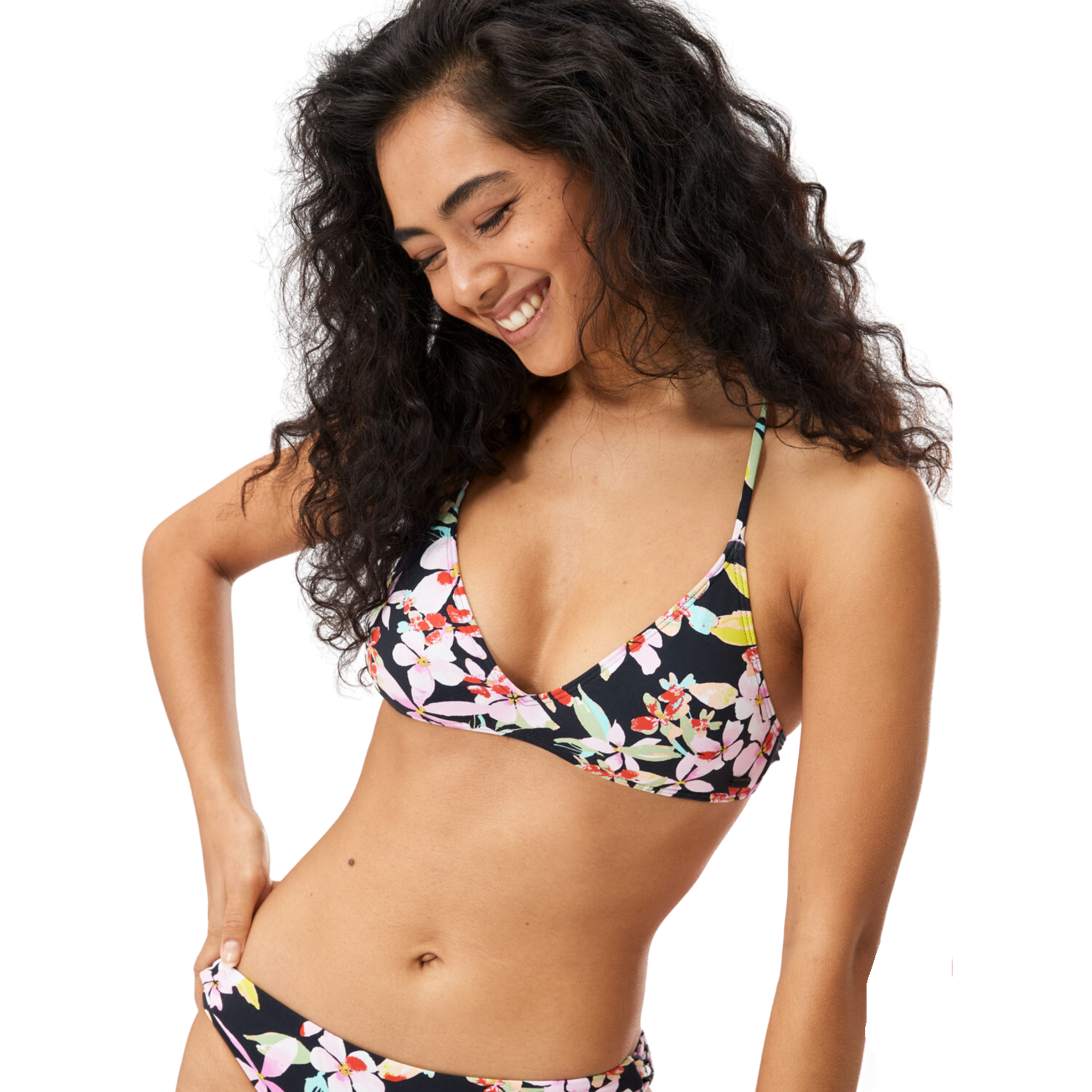 Wildflowers, made for the waves. Crafted of partially recycled nylon swim fabric, this sporty triangle bikini top has removable cups and a cross-back tie closure for an extra-secure fit you can count on in the surf.