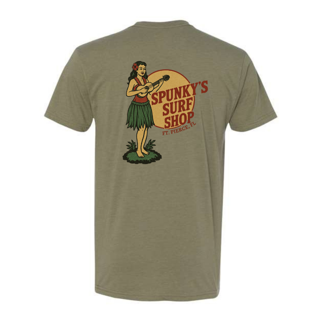 The Spunky’s “Retro Hula Sessions” Tee — a vintage-inspired design that blends classic island style with Fort Pierce surf culture. Featuring a retro hula girl strumming island rhythms against a warm sunset backdrop, this tee captures the laid-back energy of beach days, local surf history, and timeless coastal vibes. It’s the perfect mix of nostalgic artwork and modern Spunky’s style.