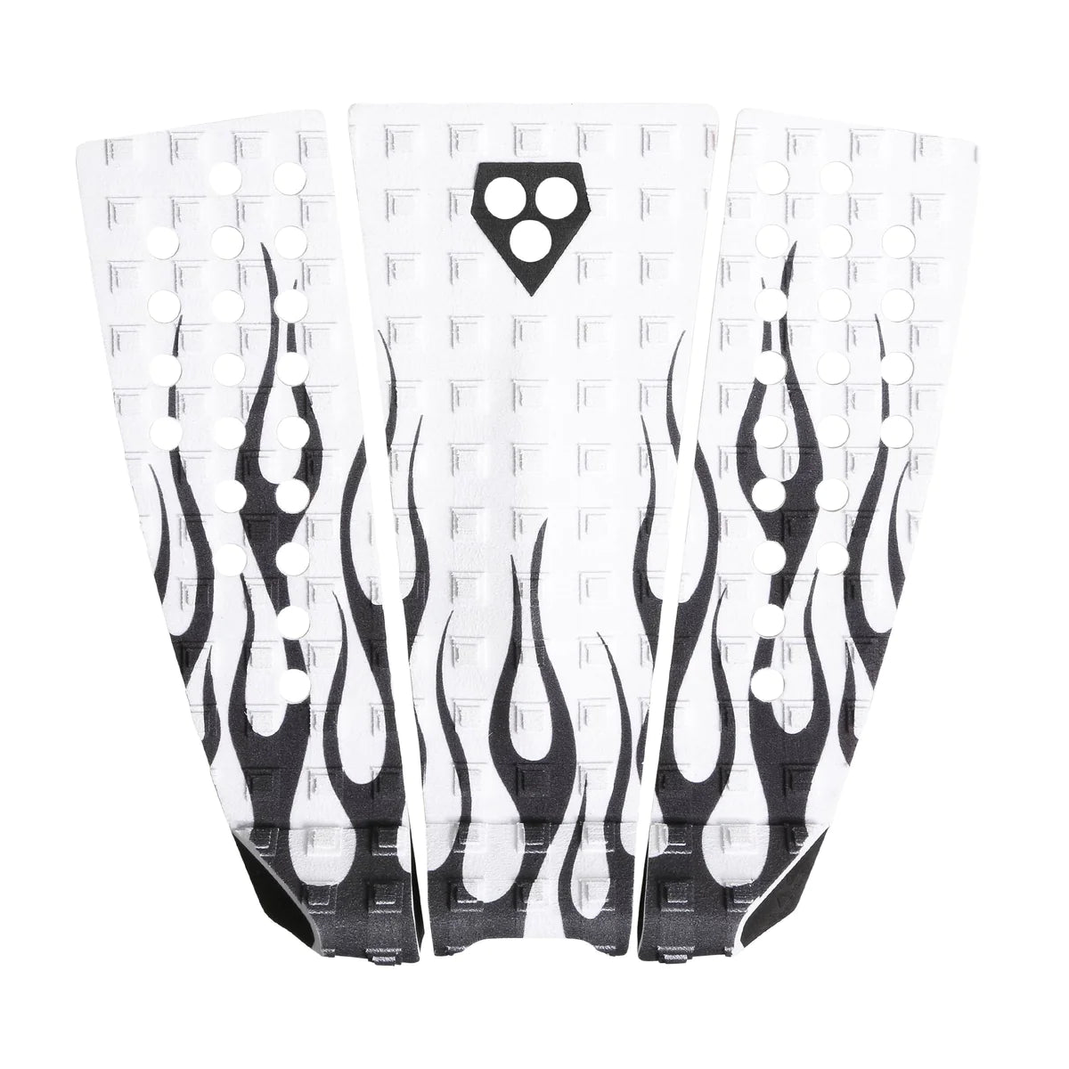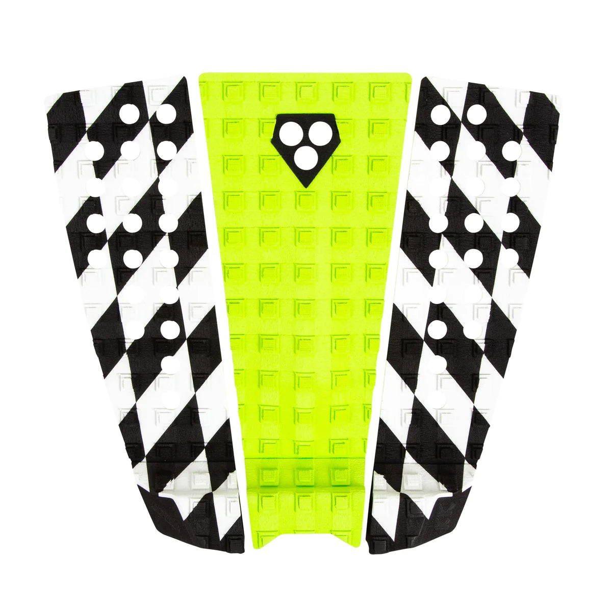 KK's pad is a contemporary performance pad with an 80's retro inspired vibe and the cuts going through the kick so it can be separated and spread out for wider tail surfboards. The steep kick, double aztec groove and circular perforations on the side panels provide an ultra sensitive  and connecting feel to the board.